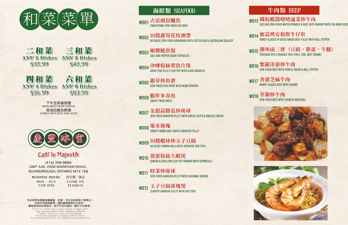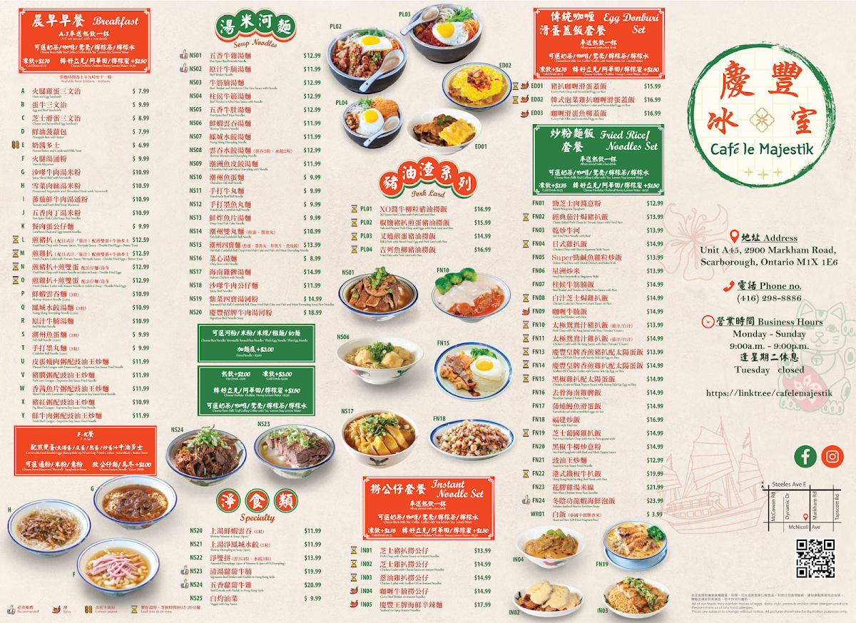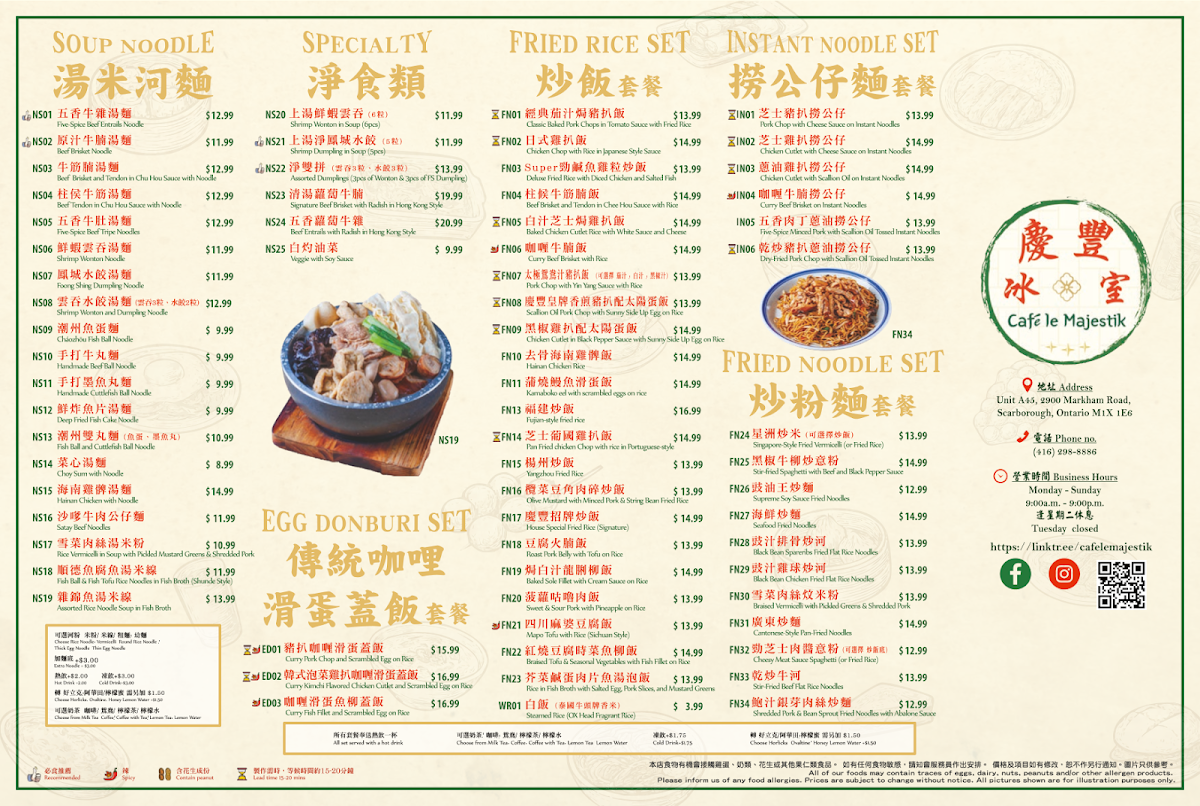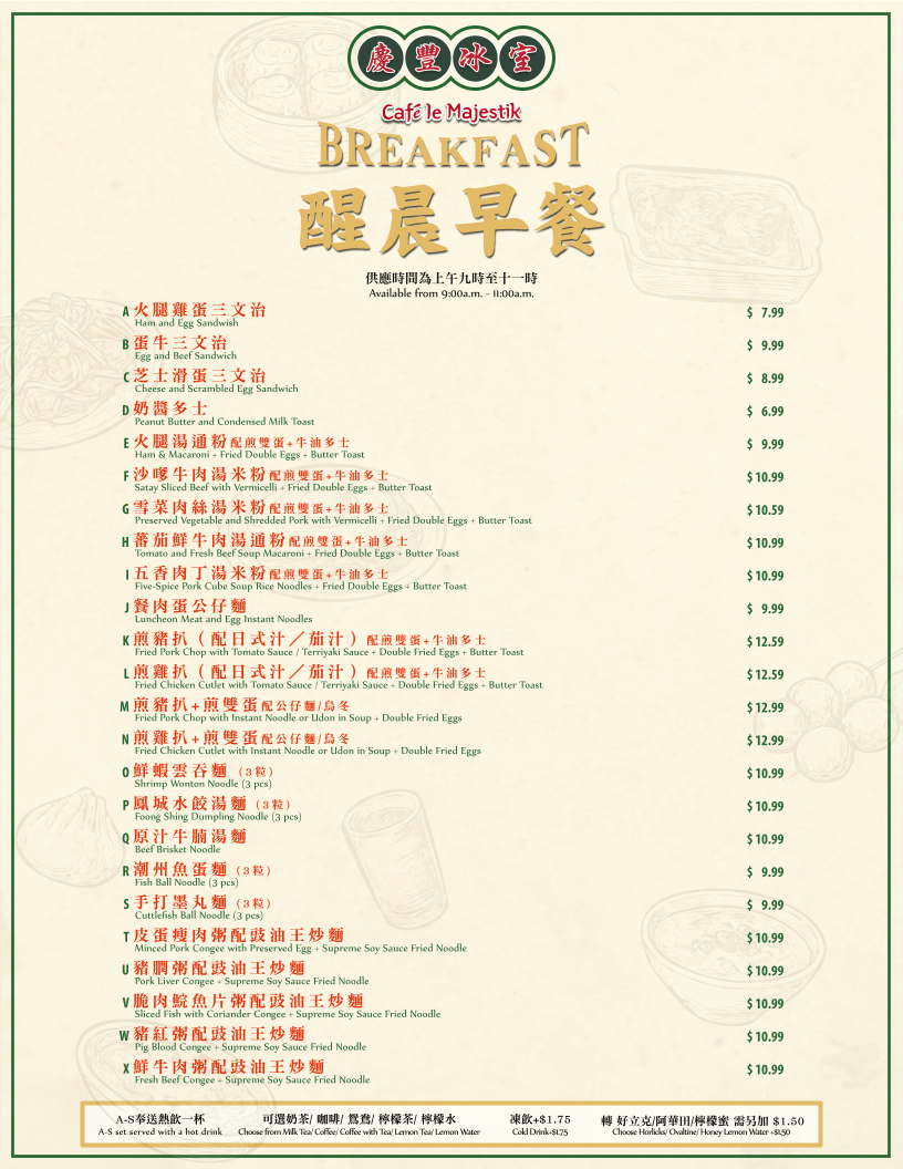 The menu at Cafe le Majestik features a variety of traditional Cantonese and Hong Kong-style dishes, offering options suitable for breakfast, light meals, and casual dining. The selection includes classic dim sum items such as shrimp wonton dumplings, as well as rice and noodle dishes like curry beef brisket with rice and beef and egg clay pot rice. There are also specialty soups like imitation shark fin soup.